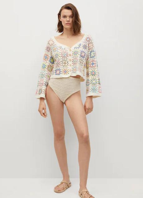En Mango tienes disponible un cárdigan precioso también de crochet de manga larga, cuello de pico y corte crop, que es ideal para las noches estivales cuando comienza a hacer un poco de aire. Tiene un precio de 59,99 euros.