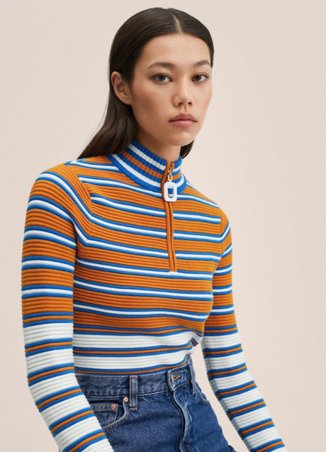 perfecta para el entretiempo: Ahora mismo va perfecto bajo la gabardina o el trench y, un poco más adelante, nos servirá como prenda única porque ya no necesitaremos tantas prendas de abrigo. Este diseño de colores, tan alegre y protagonista, lo vas a llevar sin parar. Está en la nueva colección de Mango y lleva cuello perkins con cremallera, silueta slim y un precio al límite de nuestro presupuesto con restricciones (39,99 euros).