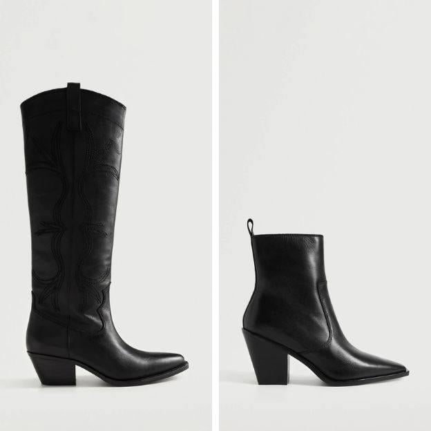 Por último, en Mango puede elegir entre dos diseños de calzado estilo cowboy. Unas botas altas de piel con diseño western, costuras decorativas, acabado en punta y que tienen un tacón bajo y ancho, en negro, por un coste de 99,99 euros. O, un botín confeccionado en piel con punta y tacón embudo, a 49,99 euros.