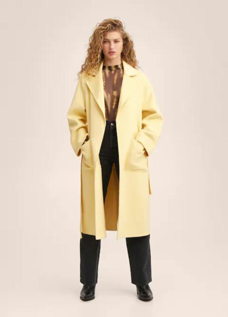 ¿La mala noticia? Que no sabemos de dónde es. ¿La buena? Que hemos encontrado uno muy parecido en Mango (119,99 euros). Se trata de un abrigo tipo batín con cinturón en color amarillo pastel de diseño oversize y cuello en pico y con solapas. No es exactamente igual que el de Lomana, pero nos encanta