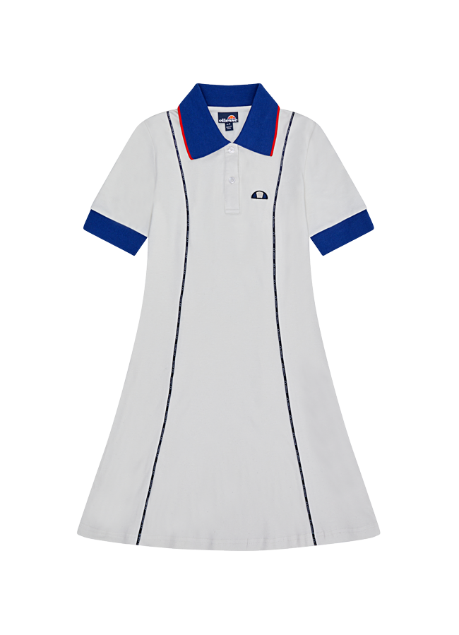 Vestido blanco corto con detalles en azul marino, falda evasé y cuello tipo polo a contraste.