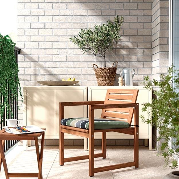 Cuando no hay mucho espacio, hay que apostar por pocas piezas, pero realmente útiles. Un mueble para almacenar, una butaca cómoda, como la Nämmäro de Ikea, y una mesa auxiliar plegable es suficiente para crear un auténtico oasis urbano. Aunque sea en miniatura.