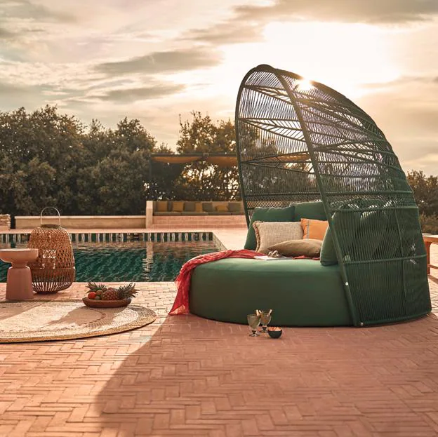 Del Caribe a África, la idea es viajar sin salir de casa. Y, aunque el espacio siempre importa, los detalles son definitivos: desde una lámpara de fibra natural a una hamaca colgada en un rincón. O esta espectacular tumbona doble, con parasol, de Maisons du Monde.