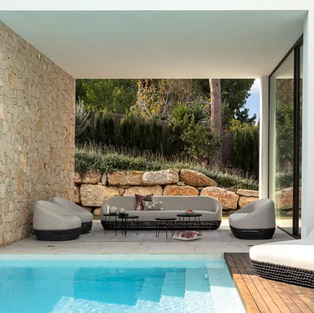 Con cuerdas o tallos de ratán que se cruzan y crean motivos geométricos, muebles y accesorios emplean el entramado para ganar carácter, originalidad y, sobre todo, ligereza. Y lo hacen jugando con los tejidos naturales y apostando por las formas curvas, que también triunfan en el interior, como los sillones Kármán, de LdK Living (arriba).