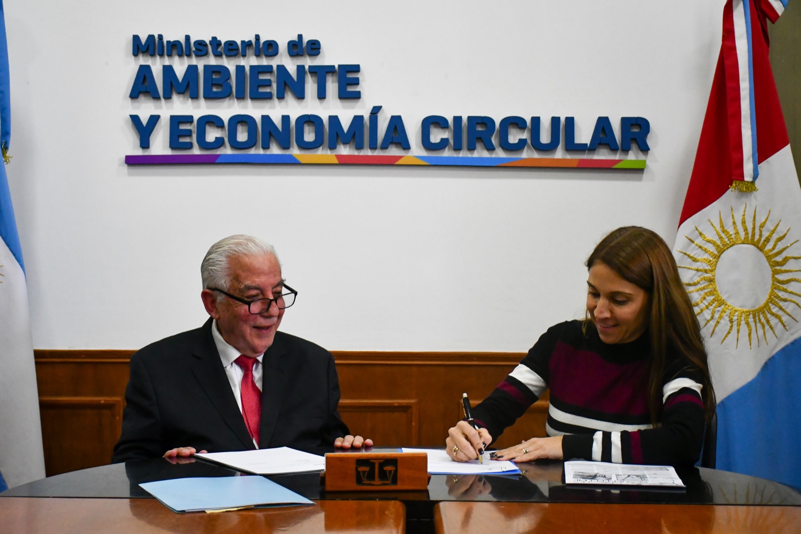 La ministra de Ambiente y Economía Circular, Victoria Flores, firmó un convenio con el Presidente del Tribunal Superior de Justicia, Luis Eugenio Angulo, para capacitar a empleados del Poder Judicial de la provincia de Córdoba en materia ambiental y desarrollo sostenible.