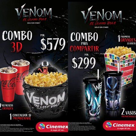 Asimismo, hay otro combo que incluye unas palomitas grandes clásicas y dos vasos de edición especial, que forman parte de una colección de seis modelos diferentes que estarán sujetos a disponibilidad en cada una de las sucursales de los complejos de Cinemex del país.