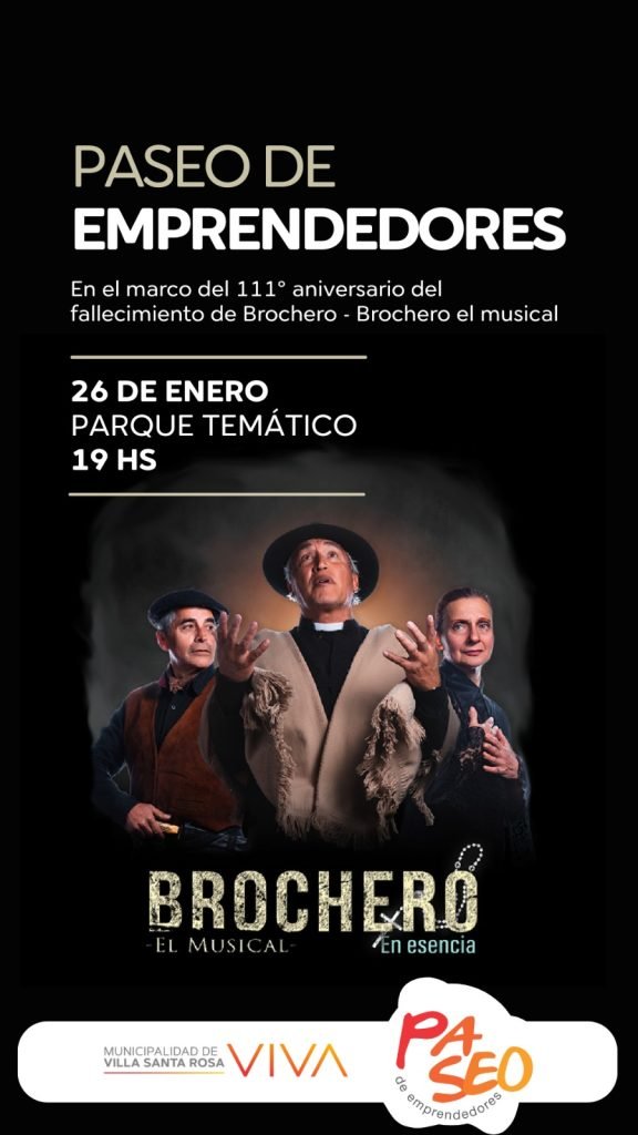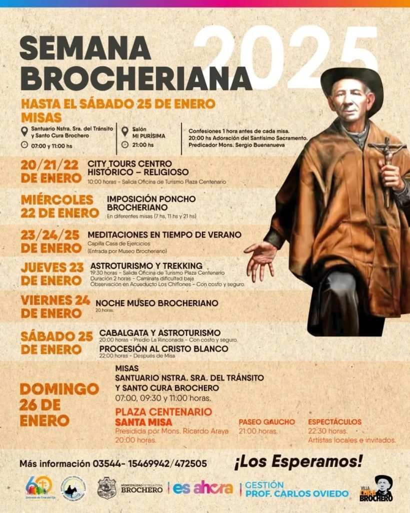 Domingo 26 de enero: 19hs. Paseo de Emprendedores en el Parque Temático. / Presentación de la obra «Brochero el Musical». / 21hs. Santa Misa.