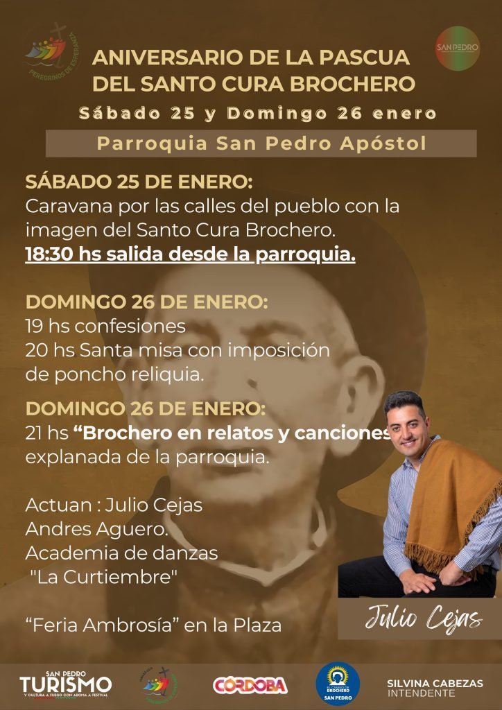 21:00 hs. BROCHERO EN RELATOS Y CANCIONES. Explanada de la Parroquia. Actuarán Julio Cejas, Andrés Agüero y Academia de Danzas La Curtiembre.