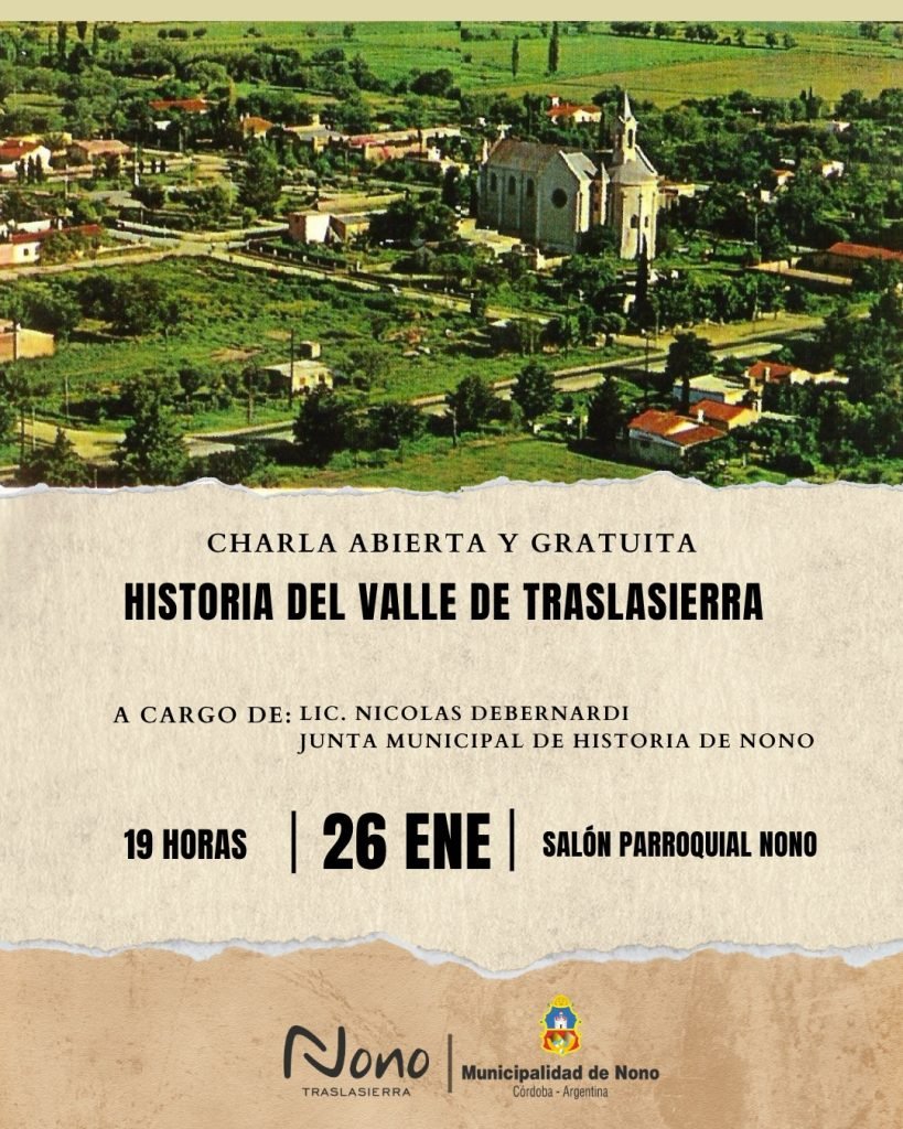 Domingo 26 de enero: 19hs. en el Salón Parroquial, charla abierta y gratuita Historia del Valle de Traslasierra.