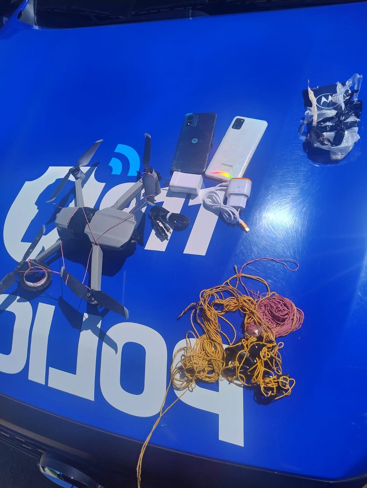 En Camino Rural kilómetro 8500 se secuestró ayer un dron con una tanza atada al mismo que trasladaba un paquete conteniendo dos teléfonos celulares con sus respectivos cargadores.