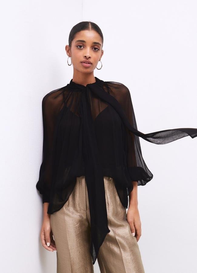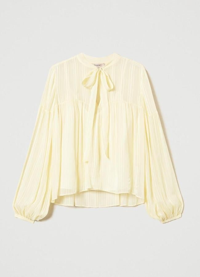 Nos encanta esta blusa de viscosa jacquard que alterna una raya de raso y una transparente de Twinset. Presenta un escote de pico con cinta para anudar en forma de lazo, suaves mangas largas con frunces, puños con elástico y canesú en la parte delantera y trasera. Precio: 246 euros.