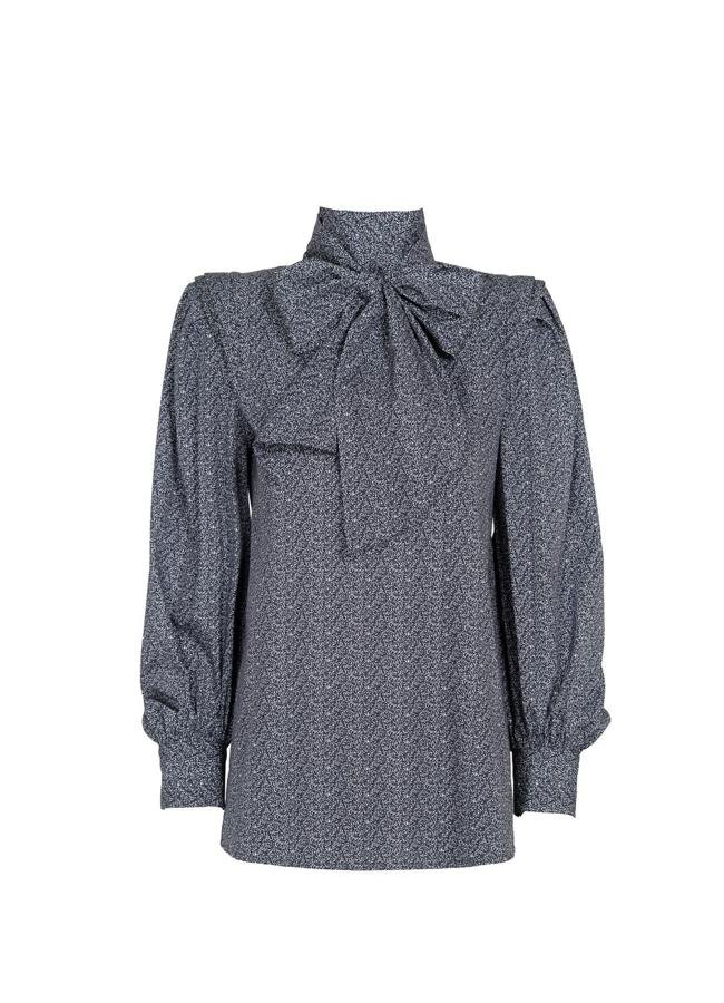 Para estilizar la figura, proponemos la blusa de cuello alto con una gran lazada que se puede colocar en delantero o espalda de Martín Alcalde. Tiene una abertura en espalda rematada con bies y que se cierra con un botón y presilla y mangas amplias con pliegues y acaban en un gran puño. Precio: 185 euros.