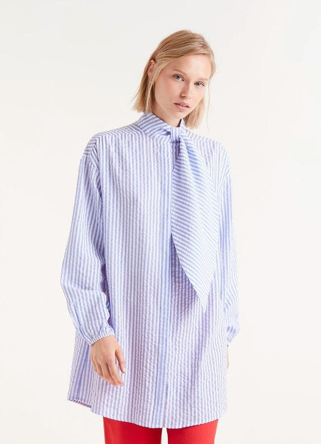 Si te gustan los cortes holgados, ficha esta camisa oversize en tejido seersucker con estampado de rayas azules de Compañía Fantástica. Lleva un cuello lazada grande y manga larga terminada en elástico. Precio: 54,95 euros.