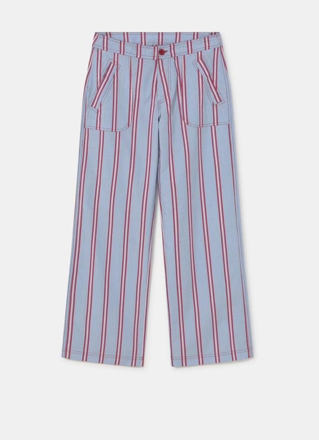 Este es un pantalón de corte recto y diseño a rayas en color azul y rojo a contraste. Lleva bolsillos laterales y cierre de botón con cremallera. Precio: 39,90 euros.