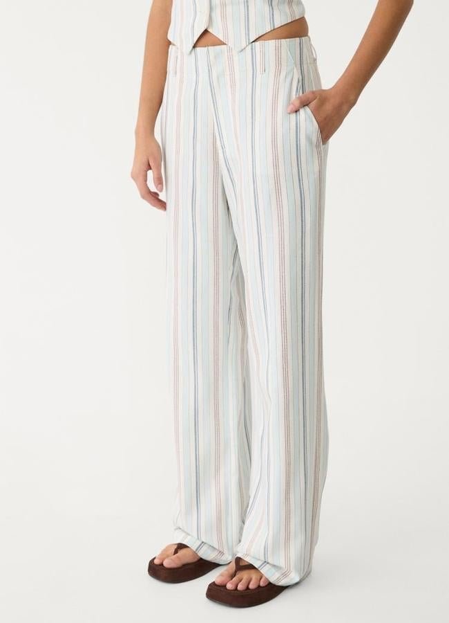 Pantalón de estilo vaquero ideal de rayitas bicolor y fondo crudo. Es comodísimo y sienta genial. Precio: 79,90 euros.