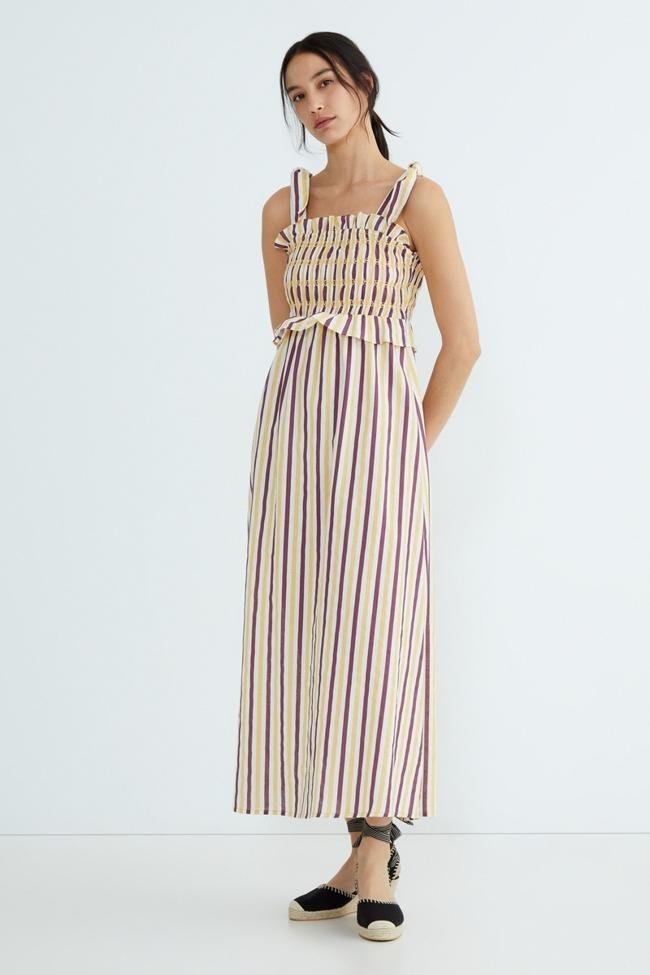 Vestido midi con el pecho de nido abeja y un favorecedor estampado de rayas (25 euros).