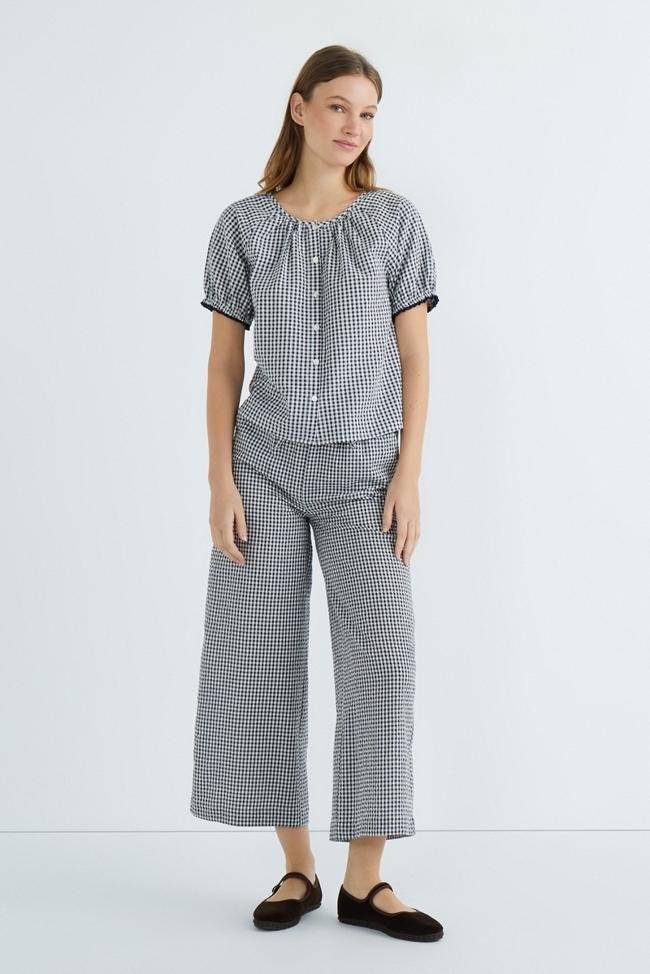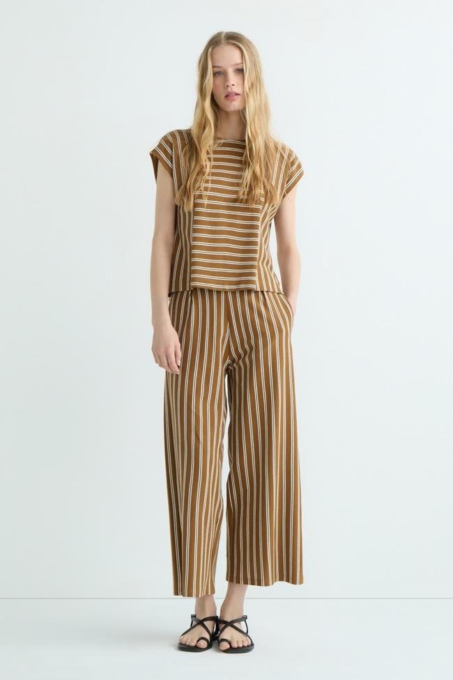Conjunto con pantalones anchos cropped (19 euros) y blusa de cuello redondo y manga corta (17 euros).