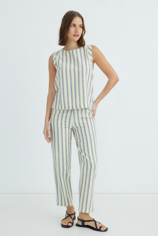 Conjunto de rayas con blusa sin mangas (17 euros) y pantalones largos (25 euros).