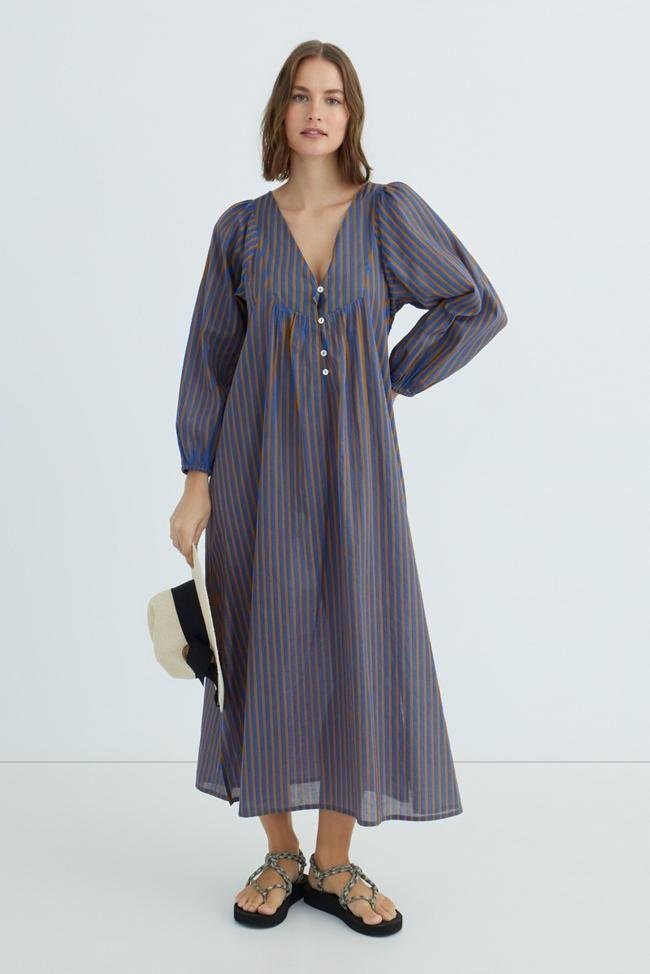 Caftán largo con estampado de rayas, escote en pico y manga abullonada (21 euros).