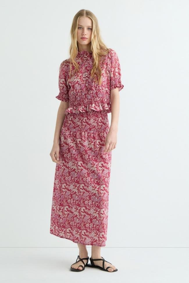 Conjunto de falda midi con frunces (19 euros) y blusa de manga corta abullonada y cuello subido (17 euros).