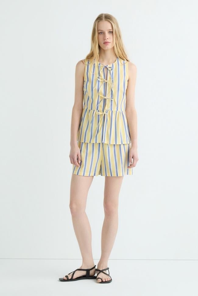 Conjunto de rayas en color amarillo con shorts anchos (17 euros) y una blusa sin manga y lazos (17 euros).