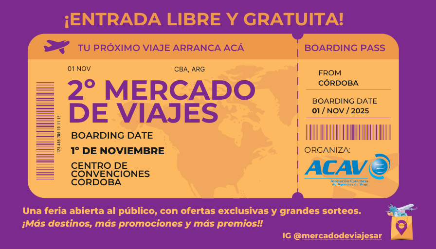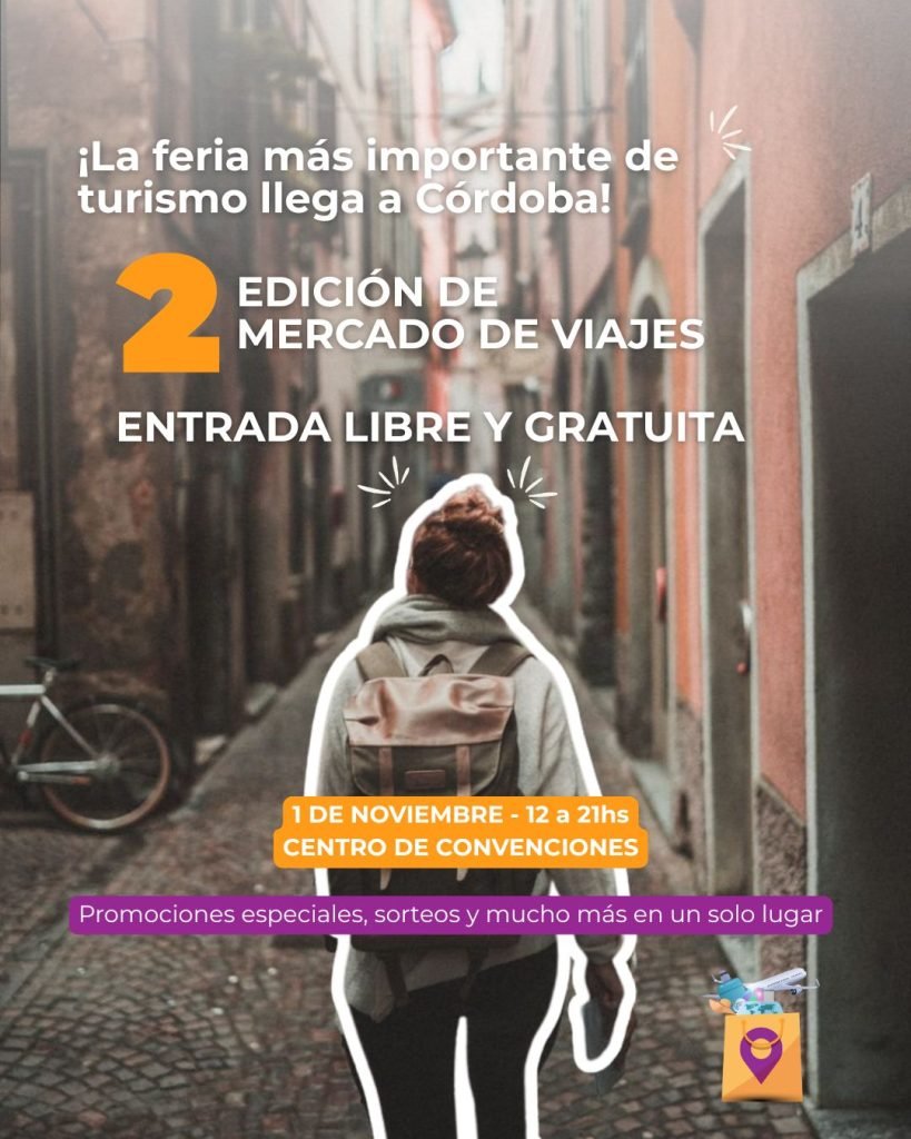 El próximo sábado 1° de noviembre, de 12 a 21 hs, el Centro de Convenciones Córdoba Brigadier Juan Bautista Bustos será sede de una nueva edición de Mercado de Viajes, el evento que reúne a los principales actores del turismo y que se consolida como la feria más importante del interior del país.
