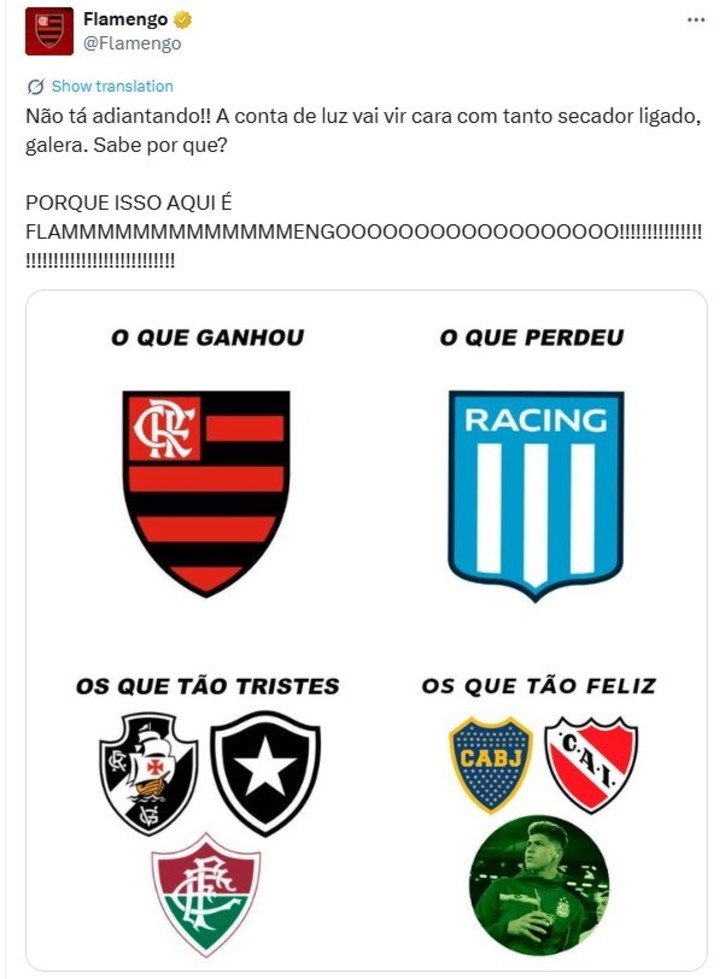 «¡No funciona! La factura de la luz va a ser carísima con tantos secadores encendidos, chicos. ¿Sabes por qué?. Porque esto es Flamengo«, compartió la cuenta oficial del club en X con los escudos del Vasco da Gama, Botafogo y Fluminense haciendo alusión a que están tristes y junto a los de Boca e Independiente que serían los equipos felices.