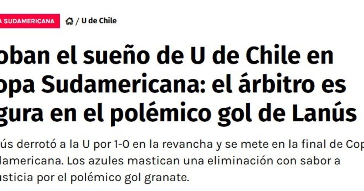 Con el duelo de ida finalizado 2-2, el club argentino torció la serie en su casa, donde se impuso 1-0 con un tanto de Rodrigo Castillo. Dicha situación enfureció a los portales más importantes del país trasandino, que salieron al cruce con sus editoriales horas después del encuentro. «Roban el sueño de U de Chile en Copa Sudamericana: el árbitro es figura en el polémico gol de Lanús«, aseguró Red Gol en su sitio oficial.