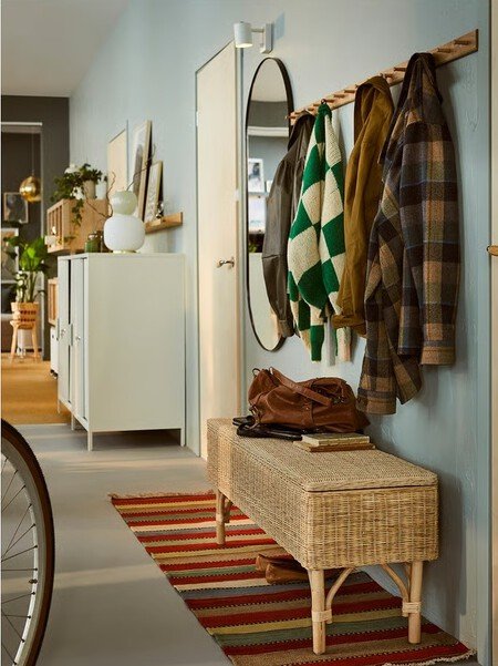 Aunque la alfombra es opcional, elegir un mueble que sirva a la vez para sentarse a calzarse y para guardar el calzado (y evitar así que no pase de esa barrera transicional) es mandatorio. Estos son nuestros favoritos de Ikea:
