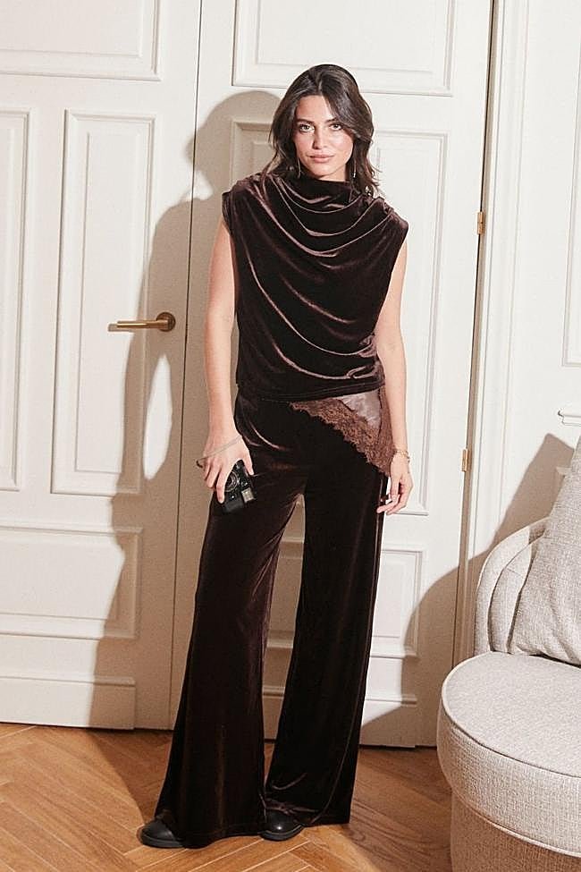 Conjunto de pantalón ancho y top de cuello fluido de color marrón chocolate. Su textura aterciopelada y el brillo sutil del tejido lo convierten en una opción versátil para looks de día o de noche. Perfecto para combinar con su blazer a juego o con tops satinados.