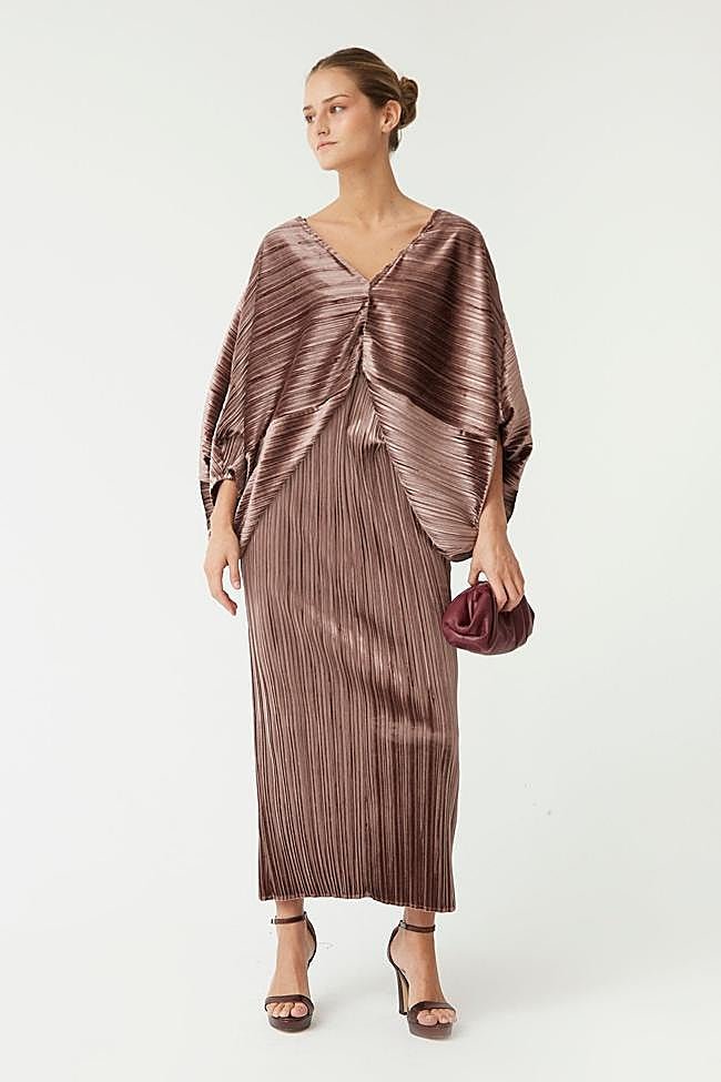 Este vestido largo es la prenda definitiva para quienes buscan una combinación perfecta de elegancia y confort. Confeccionado en un suave tejido de terciopelo que destaca por sus pliegues verticales que aportan dinamismo y sofisticación. Su diseño fluido con un escote en V y detalles de drapeado en la parte delantera crean una silueta favorecedora, ideal para eventos formales o una salida nocturna.