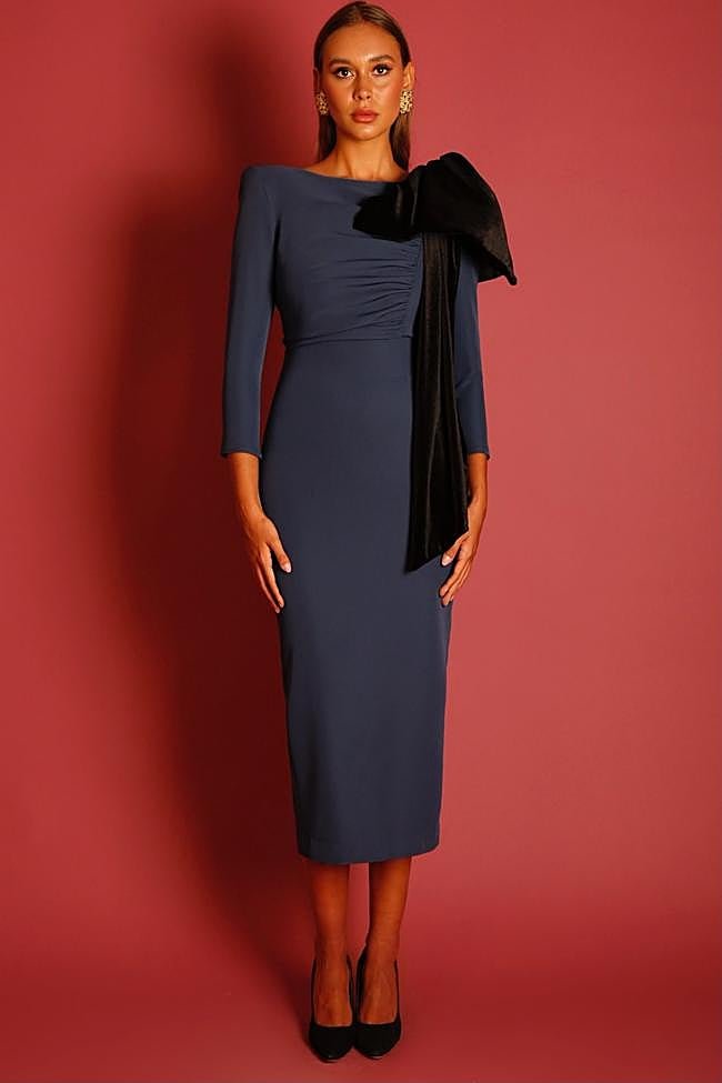Si no te convence lo de que sea todo de terciopelo y prefieres algo con un detalle, ficha este espectacular vestido midi drapeado con maxi lazada en este tejido en negro. Ha sido diseñado y confeccionado en España.