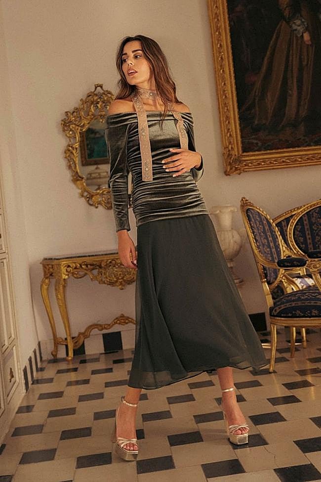 Este vestido tiene el corte a la cadera que es tendencia y combina dos tejidos: el terciopelo y la gasa. Es de manga larga, pero a la vez su escote bardot deja los hombros al descubierto. Es cómodo, favorecedor y, cuando te lo pruebes, sentirás que está hecho a tu medida.