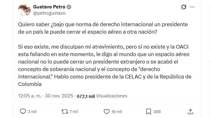 En un mensaje posteado en su cuenta de X, el mandatario colombiano Gustavo Petro cuestionó que «un presidente extranjero no puede declarar el cierre del espacio aéreo de otro país», en obvia crítica a Donald Trump, que este sábado consideró «absolutamente cerrado» el tránsito aéreo sobre Venezuela, pero en las 83 palabras de su posteo el líde roclombiano un detalle puntual: no nombró a Trump.