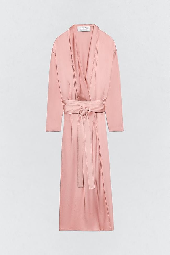 ¿Cómo es de bonito este vestido tipo batín? Confeccionado en un tejido de seda satinada en un favorecedor color rosa, tiene un diseño cruzado con manga larga y un cinturón tipo fajín tan habitual en la vestimenta oriental.