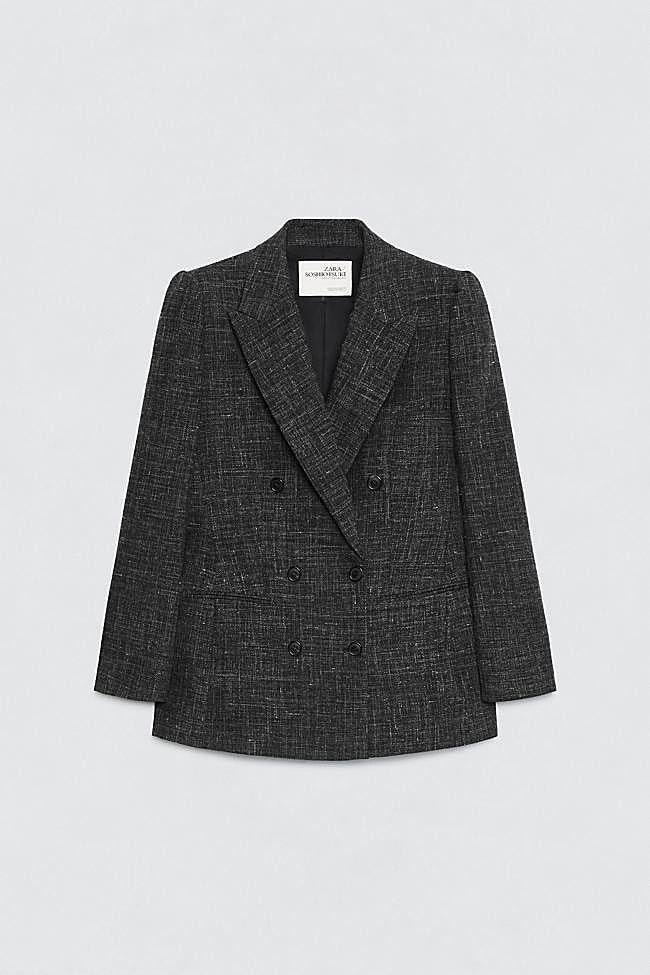 si estás en búsqueda de un look con el que ser la más elegante y estilosa en la oficina, ficha esta blazer estructurada. Confeccionada con un tejido gris marengo jaspeado, nos gusta por sus hombreras marcadas.Y tiene la falda midi a juego.