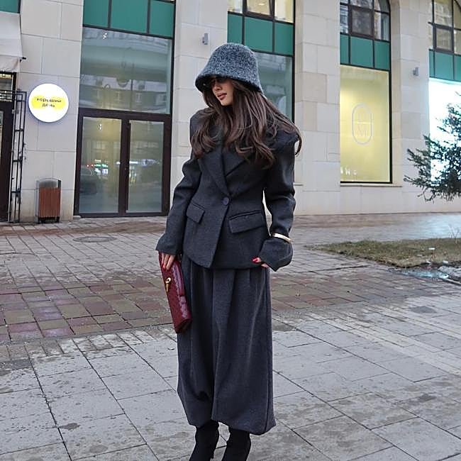 Look monocromático gris con blazer estructurado y sombrero de lana. Este look funciona porque demuestra el poder de vestir de un solo color. Estiliza al instante, elimina decisiones complicadas y eleva automáticamente cualquier conjunto.