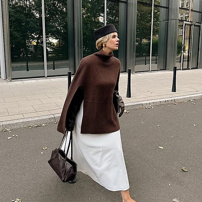 Jersey-capa chocolate, falda blanca satinada y gorro estructurado. Es minimalista, pero con personalidad, un look muy elegante y perfecto para esos días en los que no sabes qué ponerte pero no quieres renunciar a un look elegante.