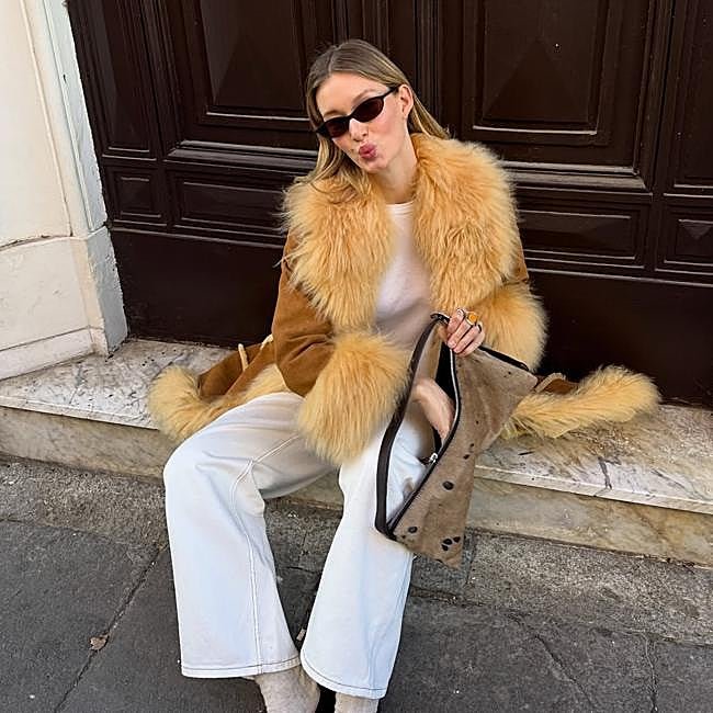 Abrigo de pelo, vaqueros blancos y mocasines negros. Es el claro ejemplo de que hay prendas que pueden salvarte cuando no sabes qué ponerte, y es que este abrigo hace absolutamente todo el trabajo. Es cálido, llamativo, favorecedor y convierte cualquier conjunto básico en un look digno de street style.