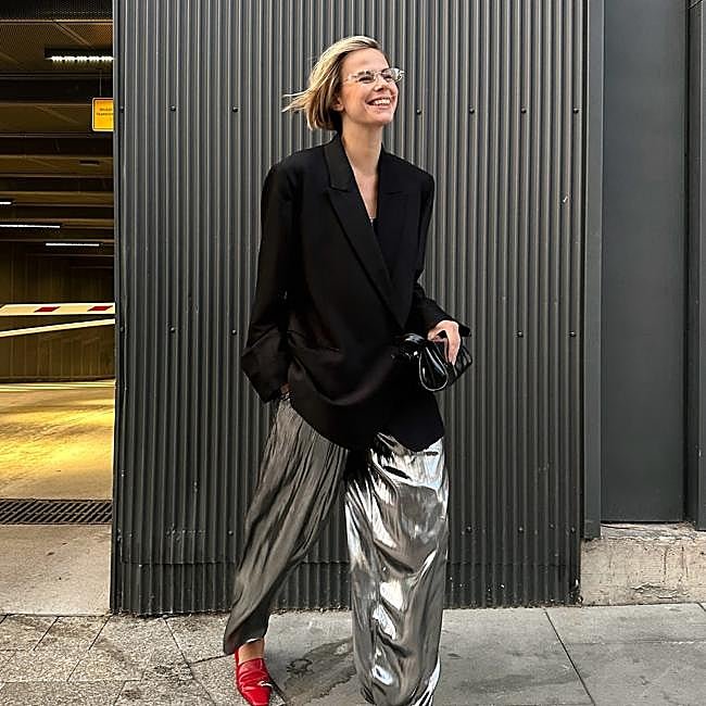 Blazer negro oversize, pantalón metalizado y zapatos rojos. Me encanta porque aporta un toque moderno que no requiere demasiado esfuerzo ni adornos innecesarios. Son básicos y un pantalón especial, por lo que es muy fácil de replicar.