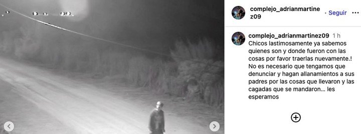 Junto a las grabaciones, en donde se observa cómo ingresaron a la cocina del establecimiento por una ventana, desde la cuenta @complejo_adrianmartinez09 publicaron un mensaje contundente. En dicho posteo remarcaron que los autores del robo ya fueron identificados tanto por las cámaras de seguridad del lugar así como también por las grabaciones de las calles aledañas.