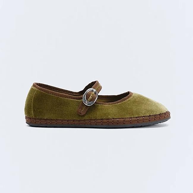 Zapatos planos de estilo bailarina hechos en España de eseOese. Tienen un tejido de algodón en terciopelo, el detalle con ribetes a contraste, un cierre mediante hebilla metálica con logo y acabado en punta redonda. Precio: 69,90 euros.