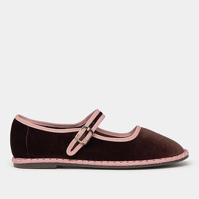 Bailarina de terciopelo bicolor de Brownie con un cierre mediante hebilla ajustable a varias medidas. Combina el marrón chocolate tendencia con el rosa palo. Precio: 39,90 euros.