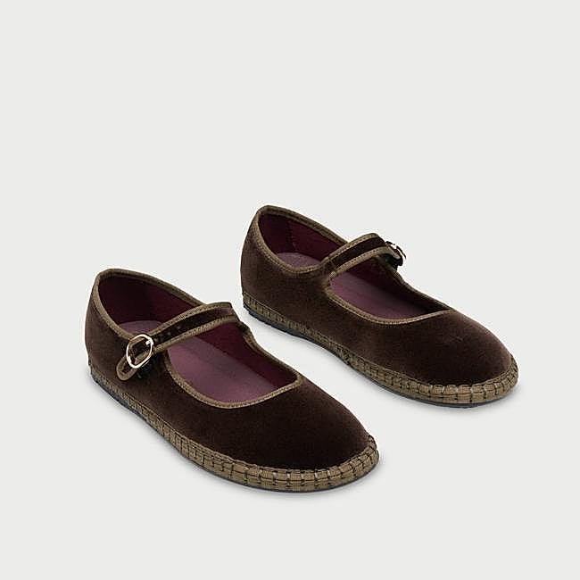 Mercedita de terciopelo en marrón de Flabelus. El exterior del zapato es 100% terciopelo de algodón, y el interior del zapato es 100% algodón orgánico con tratamiento antibacteriano. La suela está hecha de caucho producido a partir de neumáticos de bicicleta reciclados. Precio: 120 euros.