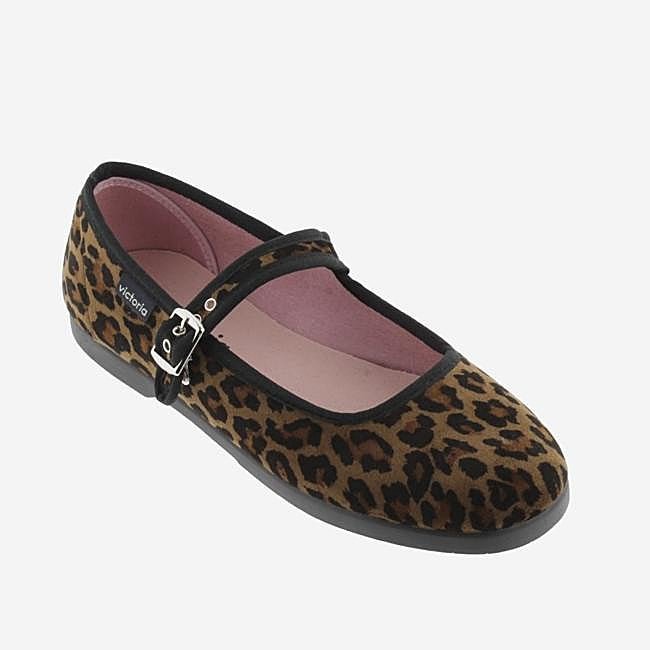 Bailarinas de terciopelo con estampado animal print y cierre de hebilla de Victoria. Están confeccionadas en España con una cómoda suela de caucho vulcanizado. Precio: 49,90 euros.
