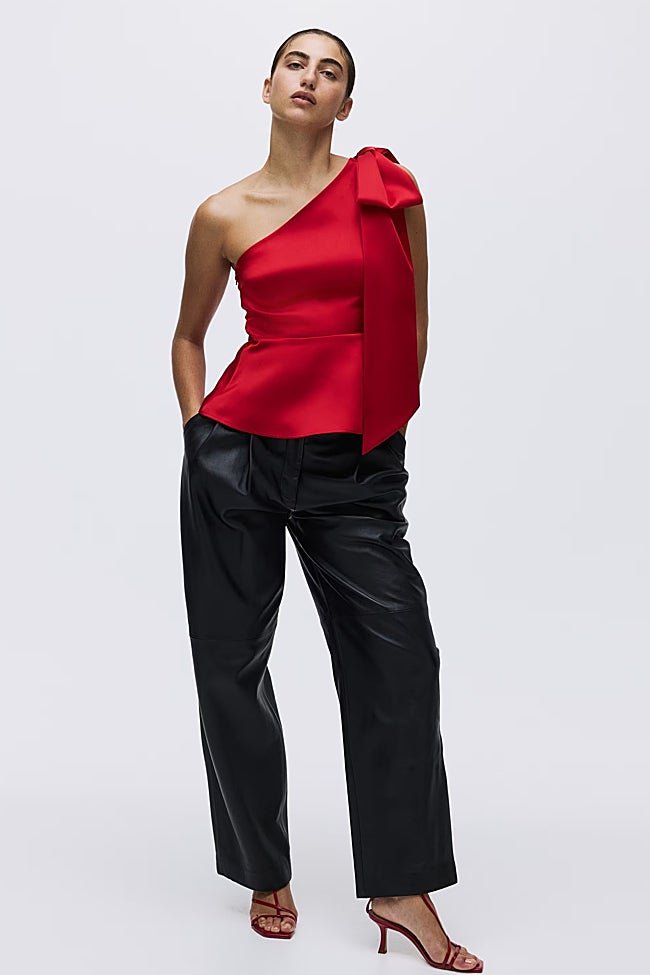 Las secciones de novedades llegan cargadas de propuestas de fiesta tan elegantes como este diseño de color rojo. Un bonito top asimétrico con maxi lazo al hombro. Imprescindible.
