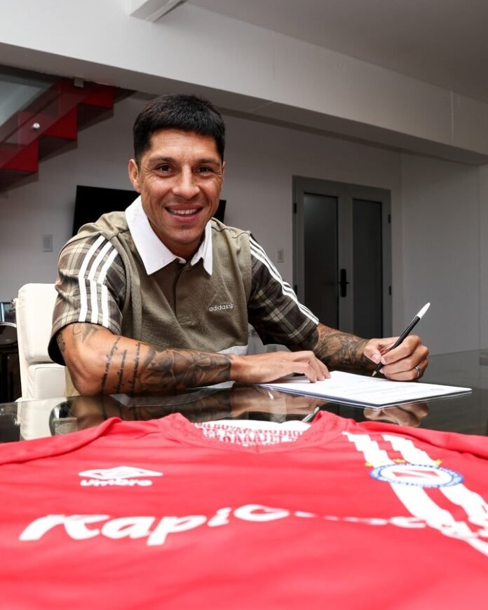 “EPJaslkjlkajfpoweafja” es el textual de la publicación que acompaña la foto de Enzo Pérez, de brazos cruzados y luciendo la camiseta titular que vestirá en la temporada 2026 con Argentinos.