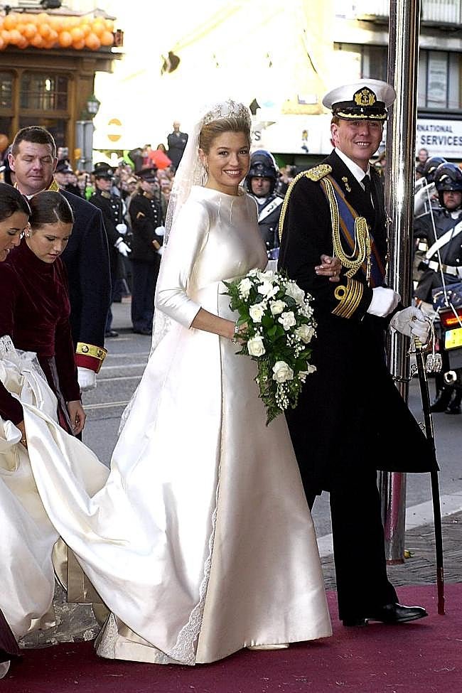 Máxima de Holanda fue una de las musas más destacadas del icónico diseñador que, como no podía ser de otra forma, creó el vestido que llevó en su boda. Era una pieza de seda en color marfil con cuello barco y mangas francesas que destacaba por su sobriedad majestuosa y que incluía discretos apliques de encaje y una cola de cinco metros. La confección del vestido llevó tres meses y fue una obra de arte que ha envejecido muy bien por su estilo clásico. La ahora reina completó el look con una tiara de perlas y diamantes.