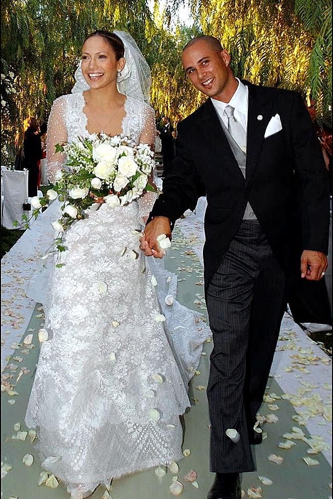 La cantante se ha dado el ‘sí, quiero’ en numerosas ocasiones. En 2001 lo hizo junto a Cris Judd y para la ocasión escogió un diseño romántico que fue diseñado por el propio Valentino. Era un vestido de color marfil, confeccionado en encaje Chantilly y caracterizado por un favorecedor diseño con escote en V en la parte delantera, mangas transparentes y una cola de seda. Una elección clásica y tradicional para la época que poco tiene que ver con los otros vestidos de novia que usaría JLo en el futuro.