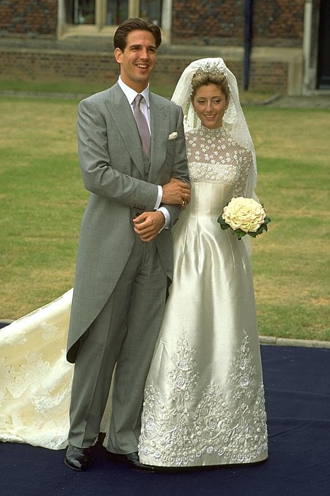 La estrecha relación del diseñador con algunos miembros de la realeza hizo que su firma estuviera presente en muchas bodas royals destacadas, como la de Pablo de Grecia y Marie-Chantal. El vestido de novia elegido fue un espectacular diseño de alta costura que marcó un antes y un después y sigue siendo, a día de hoy, inspiración para muchas. Con un cuerpo ajustado de encaje y un escote palabra de honor, destacaba por una falda voluminosa tipo tulipán con bordados de hilo de plata y perlas, una cola de cuatro metros y un velo de casi cinco.